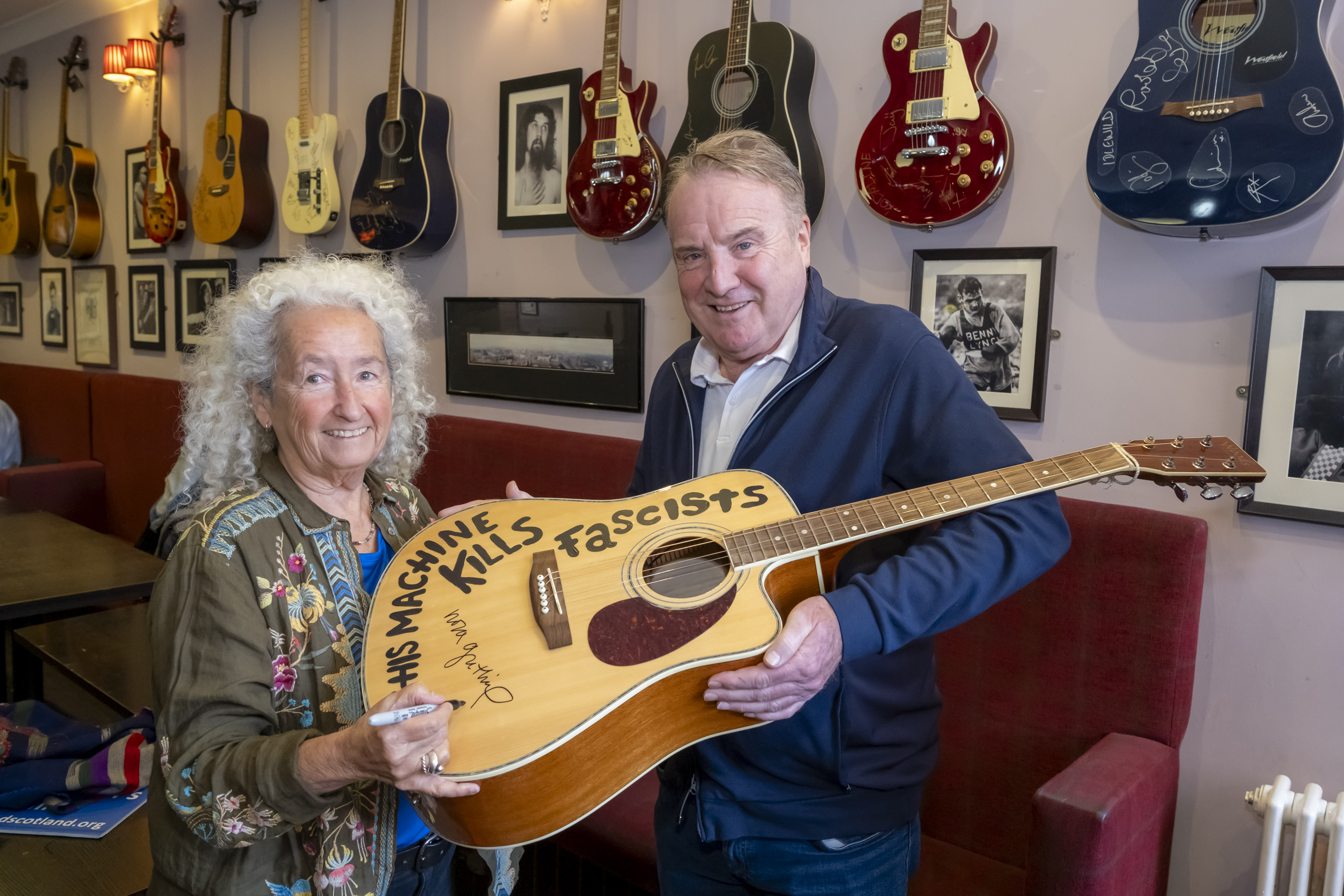 Yesterday she was welcomed to Glasgow by Scottish Huntington’s Association during her visit to The Clutha Bar on the Clydeside, where her father played an unplanned set while on shore leave from a US Merchant Navy shop during the Second World War. She also met bar owner Alan Crossan, musicians including James Allan from Glasvegas,  and members of the public who popped in to have a chat about Woody Guthrie, his music, and Huntington’s disease.